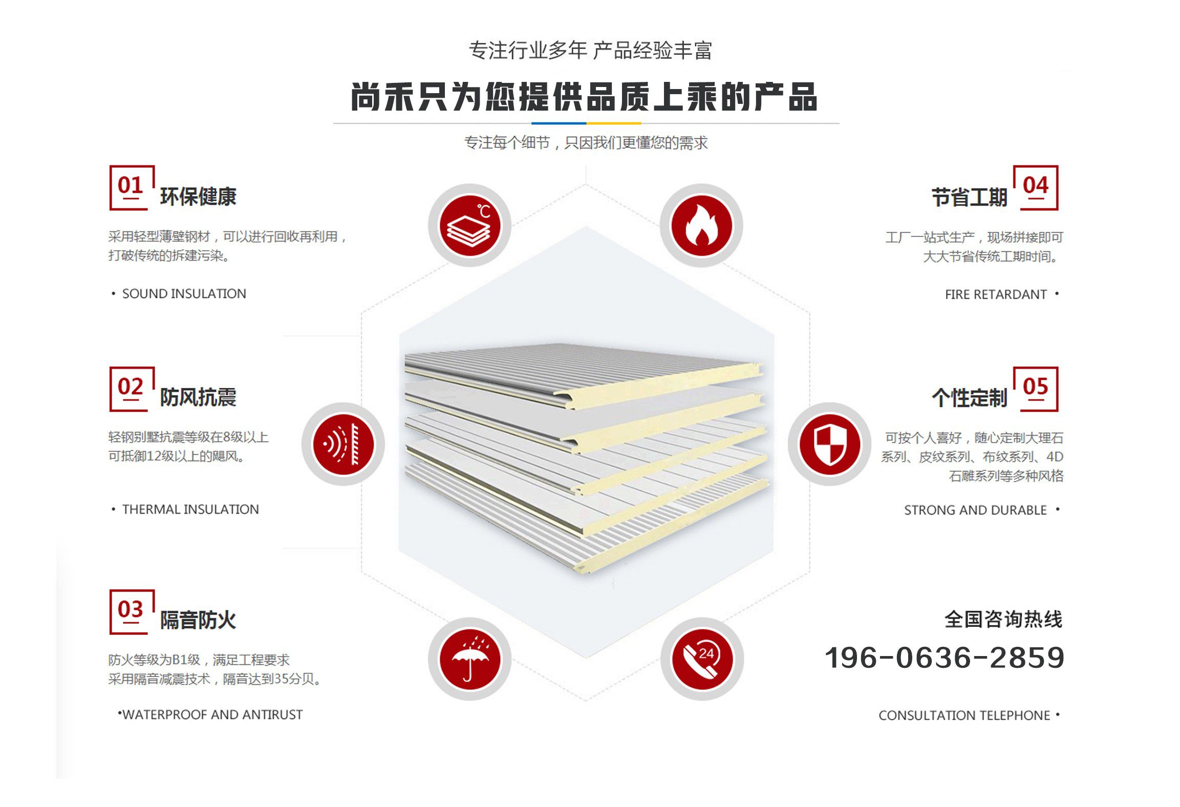 山東尚禾經貿有限公司是集板材設計、研發(fā)、生產、施工、一體化的科技公司,并在同行業(yè)中率先通過了質量、環(huán)境、安全管理體系認證。公司2011年投入資金2000余萬元引進世界先進的聚氨酯節(jié)能板連續(xù)生產線、意大利進口發(fā)泡系統(tǒng),采用六組份在線自動操作混合澆注技術,在線一次性完成社會配料中心或工廠的配比混合工藝,并可以根據溫度在線自動調整,從而生產處與眾不同的高強度、節(jié)能型、綠色環(huán)保的聚氨酯夾芯板。(其使用年限高于同行業(yè)其他品牌5-10年) 公司主要經營范圍包括聚氨酯夾芯板,PU夾芯板,冷庫板,潔凈板,聚氨酯冷庫板,冷庫保溫板的設計、生產、銷售、技術指導、安裝及一體、以及進出口業(yè)務,是中部六省最大的綠色節(jié)能建材生產基地。聚氨酯夾芯板年產200萬平方米、PU夾芯板、冷庫保溫板500萬平方米、鏈整產業(yè)綜合實力,開創(chuàng)了六省至中西部創(chuàng)新型中小名企總部基地,并將著力推進中國中西部地區(qū)集成房屋住宅產業(yè)化發(fā)展進程。 科技創(chuàng)新、節(jié)能典范。千萬間始終秉承“誠信、合作”的企業(yè)文化精髓,長期致力于鋼板材結構節(jié)能建筑產業(yè),愿與社會各界攜手合作,共鑄綠色、環(huán)保美好未來。 產品具有良好的絕熱、阻燃、隔音、環(huán)保、耐久性能,可廣泛應用于工業(yè)、商用建筑內外墻、以及民用建筑外墻保溫、空調通風系統(tǒng)、專用防火保溫門等領域。 我們始終秉承...